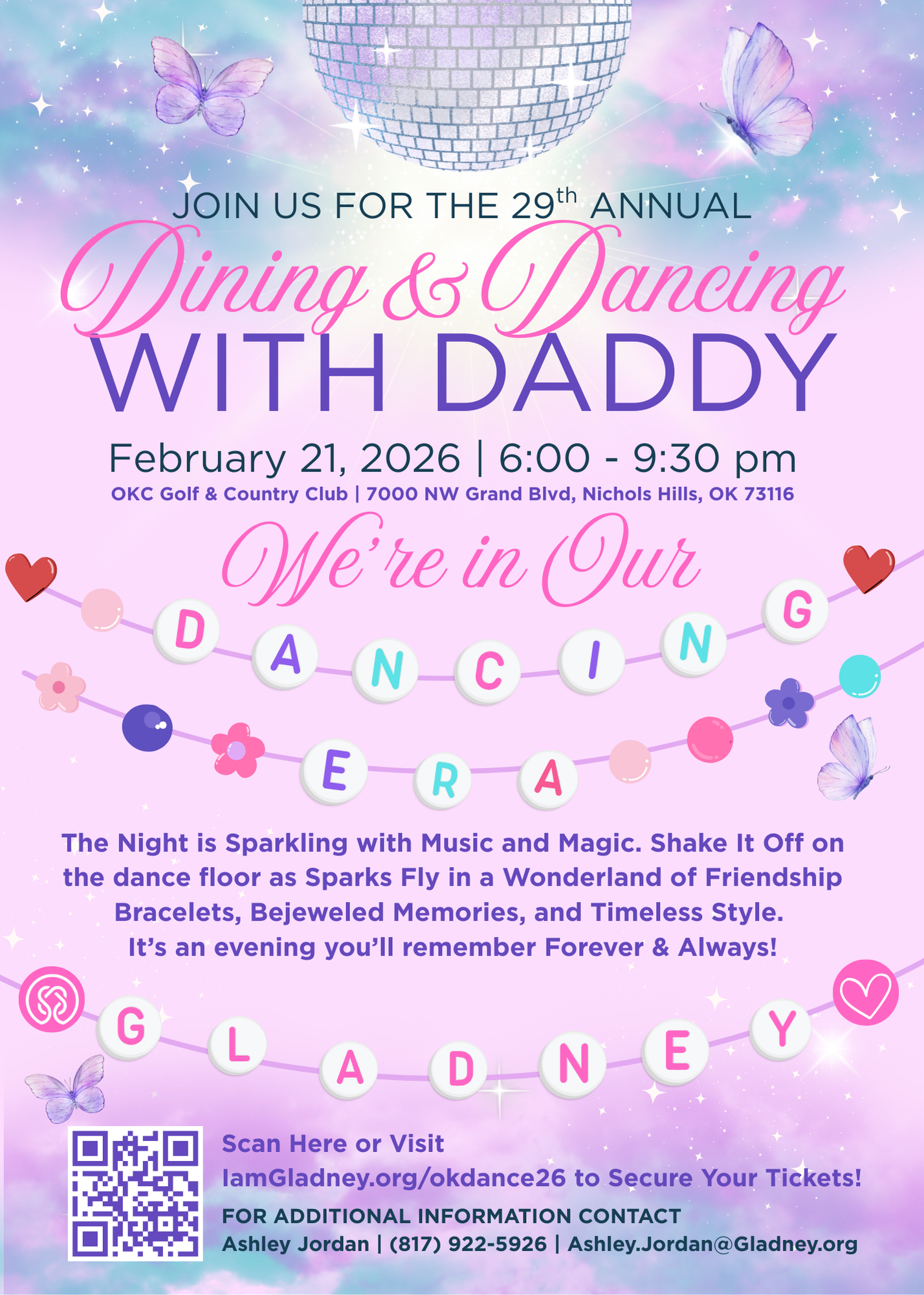 Join us for an "Enchanted" evening at the 29th Annual Dining and Dancing with Daddy in Oklahoma City. It’s a night to "Begin Again" with dinner, dancing, and memories that will never go “Out of Style.” Under the stars, we’ll “Shake It Off” and celebrate Gladney’s mission of creating bright futures through adoption—because every child deserves a loving home.